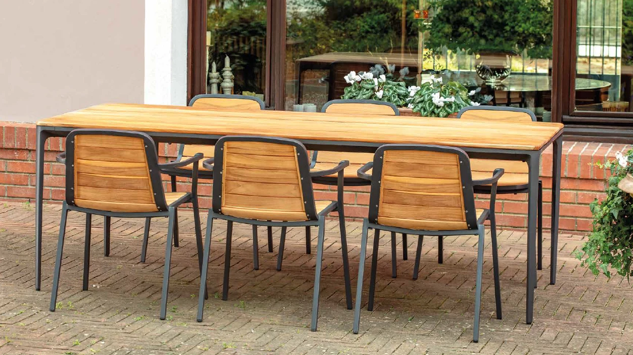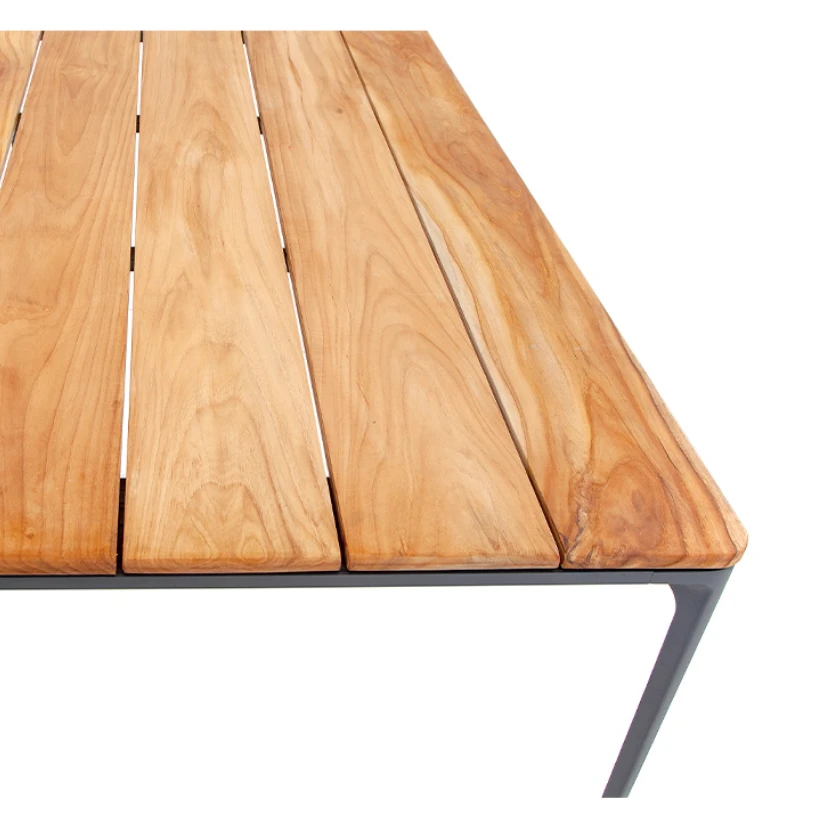 A Bahamas kültéri étkezőasztal visszafogott megjelenésű, jól kombinálható darab teraszra vagy kertbe. Alumínium váza fehér vagy antracit színben elérhető, a top pedig alumínium vagy tikfa kivitelben kérhető. UV- és időjárásálló anyaghasználata miatt hosszú távon is megbízható választás kültéri étkezésekhez.