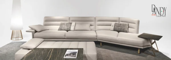 Ennek a modern kanapénak ferde alja és a háttámla párnáinak vízszintes domború szalagjai hangsúlyozzák annak geometrikus modularitását, azonnali kényelmet nyújtva. A kanapé veleszületett nagyvárosi eleganciáját tovább fokozzák a különböző méretű dohányzóasztalok és a változatos felületek, amelyek mélységet és egyediséget kölcsönöznek a lendületes formavilágú kompozícióknak.