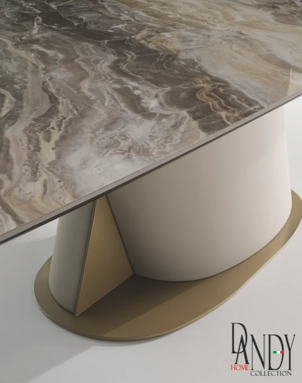 Ez az étkezőasztal kiemelkedik a cég jellegzetességeivel, amint az alapzat szépségéből is kitűnik. Az ívelt fémből készült talpak, bőrrel kárpitozva, ügyes részletekkel, a fémlemez pedig különféle kivitelben kapható. A kerámiából és márványból készült asztallapok többféle méretben kaphatók.